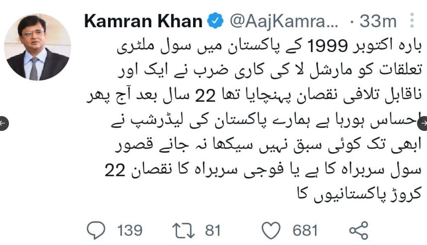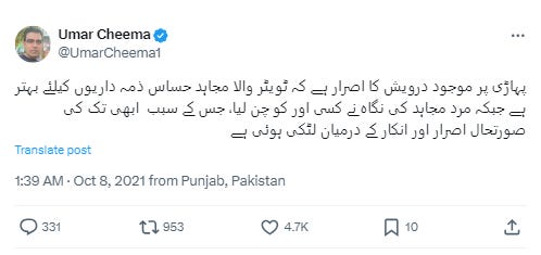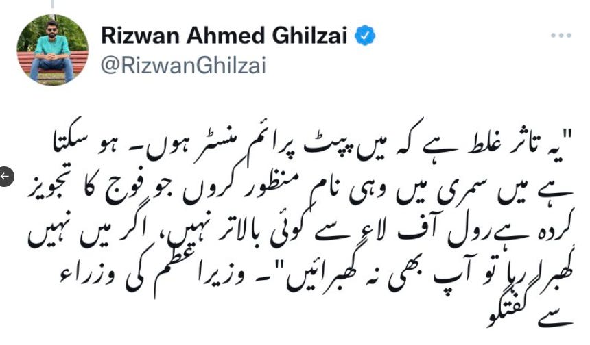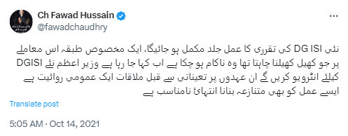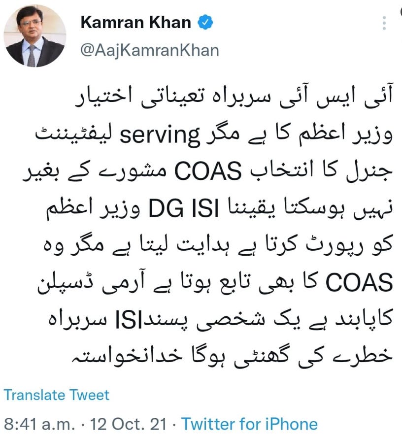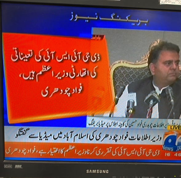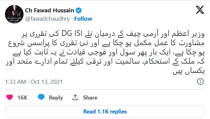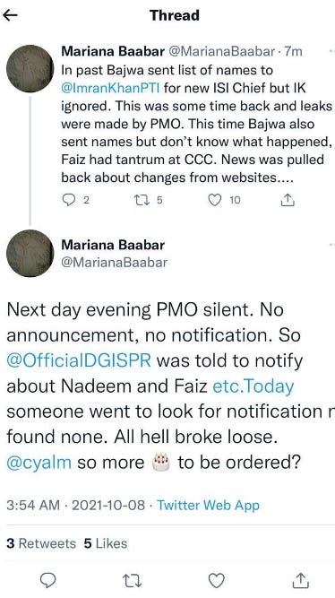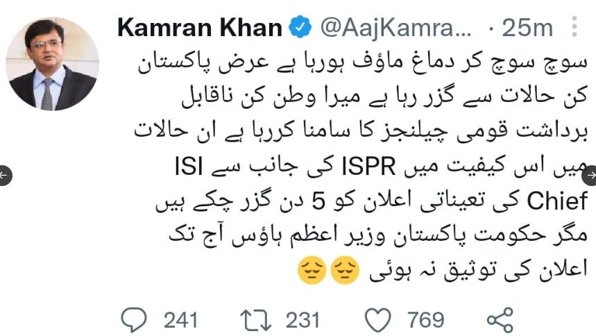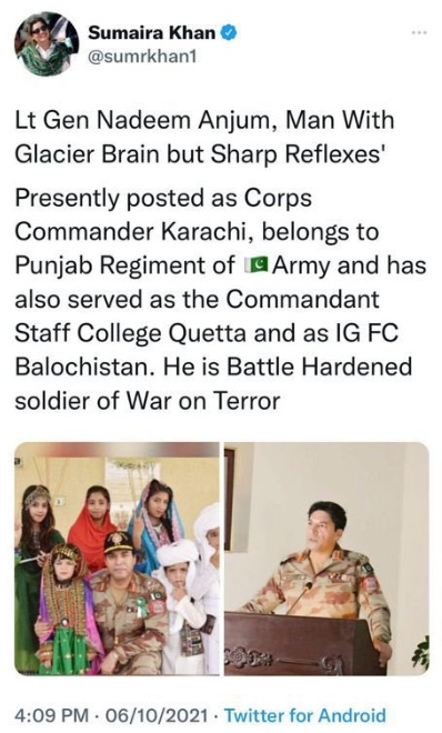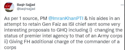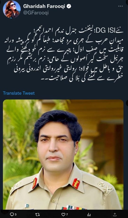 Rumors were also circulating that Gen Asif Ghafoor (former DG ISPR) was also angling for the DG ISI slot. Can’t find the tweets but it was being reported that he with his wife went to meet PM’s wife to intercede on his behalf for the position.
