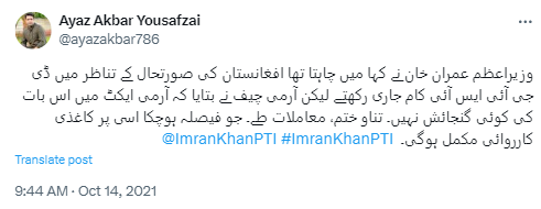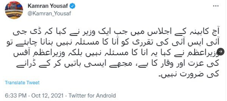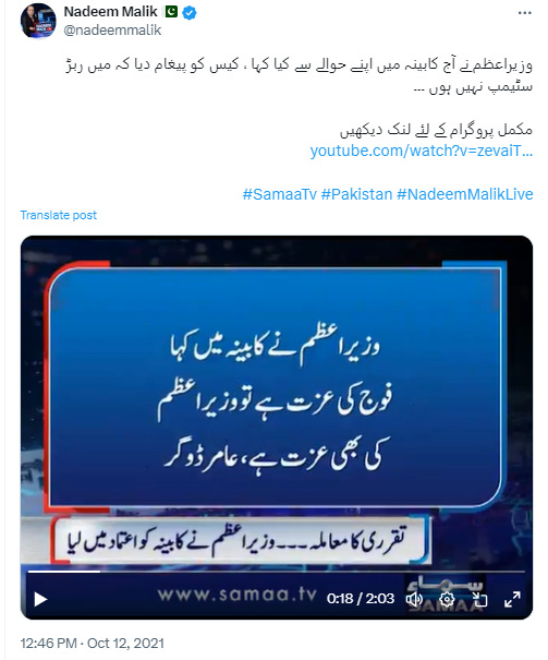 While briefing the media on the 16 October cabinet briefing, Fawad Chaudhary stated: “There are many on the social media who have wishes [to cause a rift between the civil and military leadership], I want to tell them that the Prime Minister’s Office will never undermine the respect of the Pakistan Army and the Army Chief. And the Army Chief and the army will never take any step that will undermine the respect of the Prime Minister or civil setup”.
