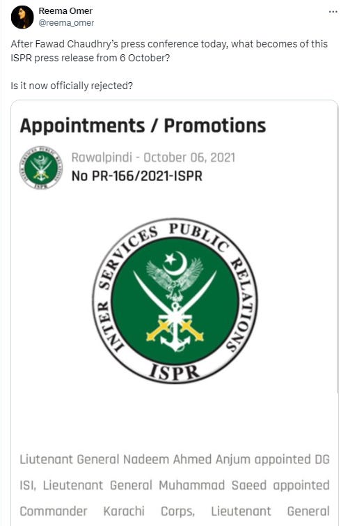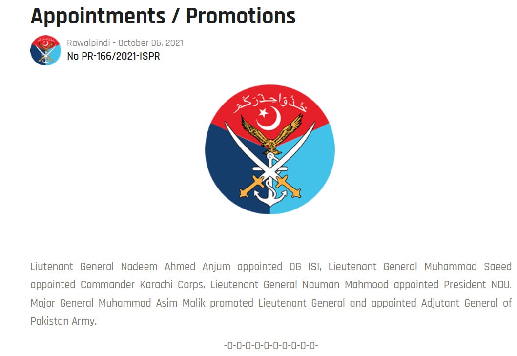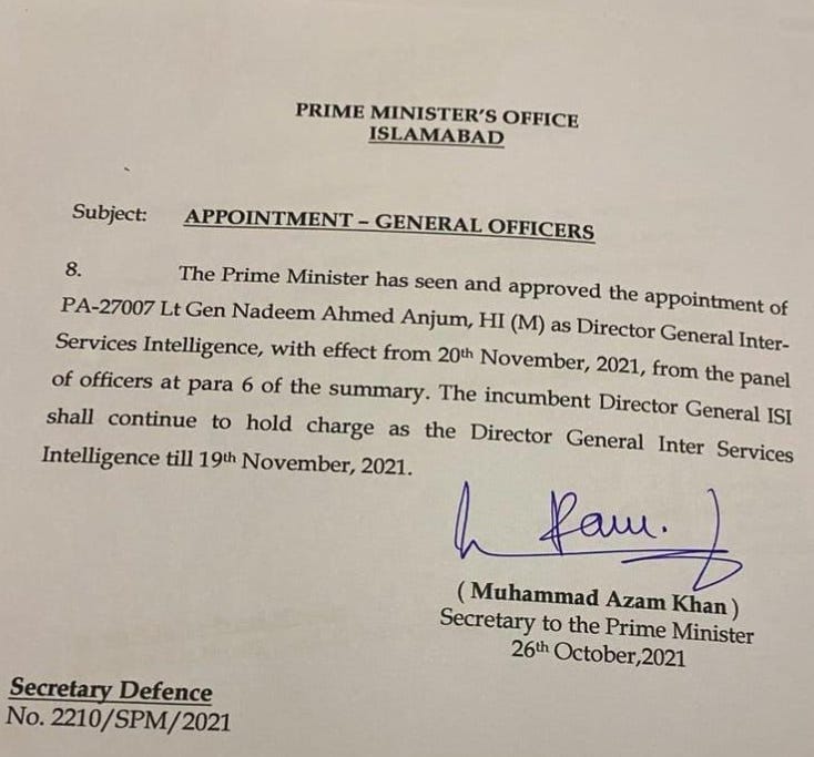 ISPR issues the notification that Nadeem Anjum has been appointed as DG ISI (which means Faiz Hameed has been replaced).