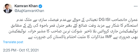 This sorry saga comes to an end as the notification is finally issued. But PM still gets his small victory. While the ISPR notification was from immediate effect, PM appoints Nadeem Anjum as DG ISI with effect from November 20th, 2021.