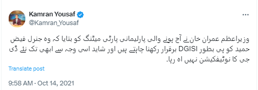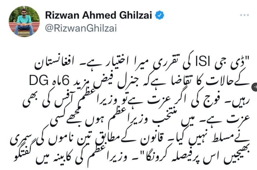 To a question, he said: "At present, Lt-Gen Faiz Hameed is the DG ISI".