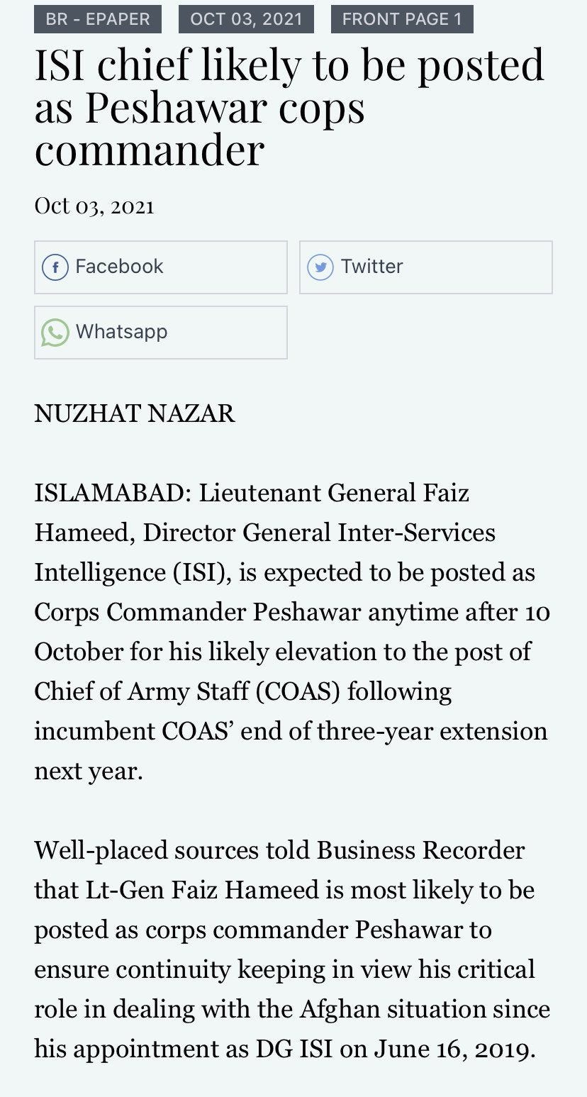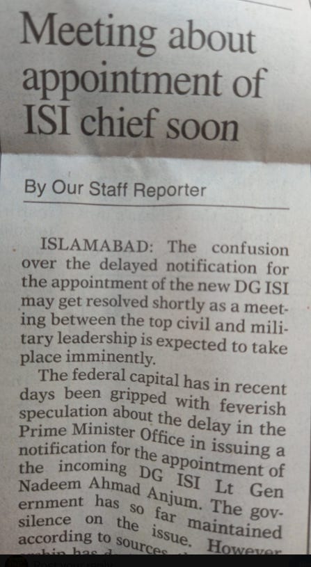 Business Recorder made a faux pas by publishing an article suggesting that the Director-General of ISI is on track to be appointed as Corps Commander, positioning himself for eventual promotion to COAS. (Can you believe such speculative pieces being written elsewhere, with journalists predicting the next moves of spy chiefs, all in pursuit of bolstering their CVs with necessary corps commander credentials for higher military ranks?) Business Recorder swiftly removed it from their website within a couple of hours. Unfortunately, it remains accessible on their e-paper site and as a screenshot.